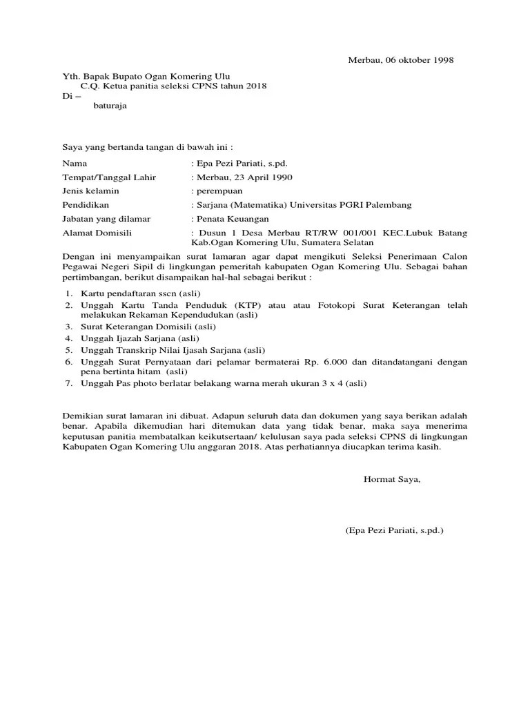 Download di sini link lampiran surat penyataan dan surat lamaran . Ibu kota kabupaten ini terletak di martapura. Tubuh dan dilanjutkan ke meja panitia untuk pemeriksaan berkas, diantaranya, kartu ujian, surat lamaran dan surat pernyataan bermeterai. Seperti yang diinformasikan pada surat pengumuman penerimaan cpns oku, bahwa untuk lokasi tes akan berkoordinasi dengan bkn palembang. Contoh surat lamaran ……………, ….